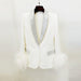 The Celebrity Fashion Luxury Ostrich Real Feather Rhinestone Green Fruit Collar Blazer is the perfect solution. Designed to combine elegance with eye-catching details, this blazer transforms your look effortlessly. Its slim fit silhouette provides a flattering shape, while the unique green fruit collar adds a creative and distinctive touch that sets you apart from the crowd.