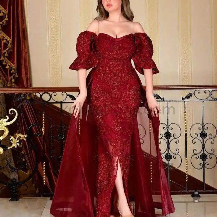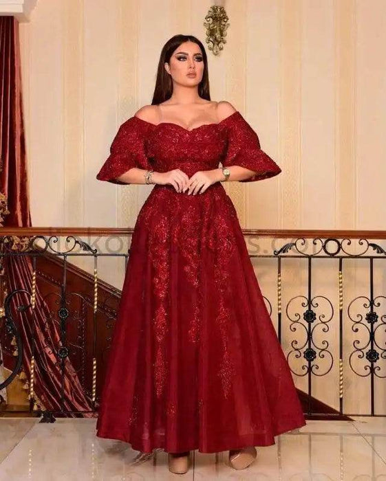 The empire waistline cinches in at the natural waist to create a slimming effect. The V-neck neckline is flattering for all face shapes. The simple fashion element is perfect for any special occasion. The embroidered details add a touch of luxury. The A-line silhouette is flattering for all body types. The half long sleeves provide coverage and style. The off-shoulder design is both fashionable and elegant. Plus size options are available. The anti-wrinkle fabric is easy to care for. The breathable fabric is comfortable to wear.