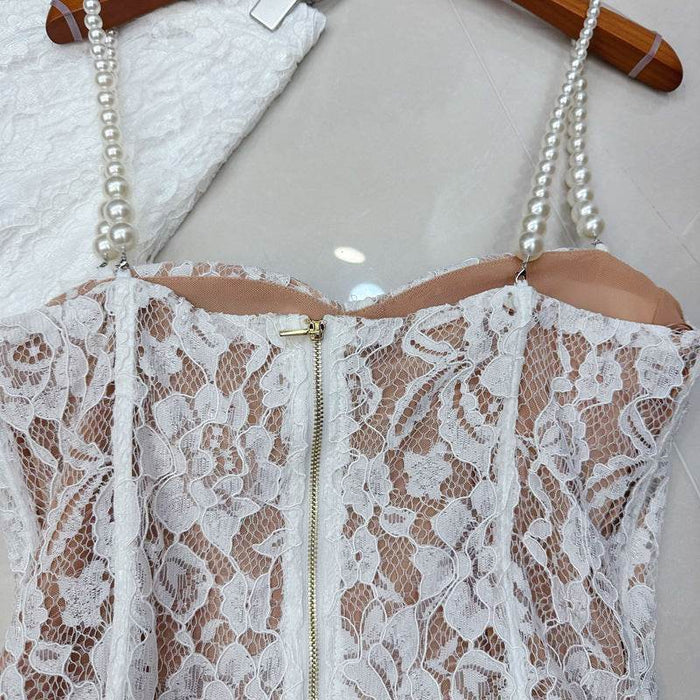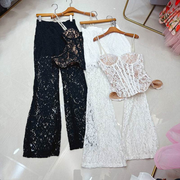 Elevate your wardrobe with the Lace Embroidered Fishbone Pearl White Camisole Vest and Straight Micro-pants Set. This sophisticated ensemble is designed for the modern woman who appreciates both style and comfort.